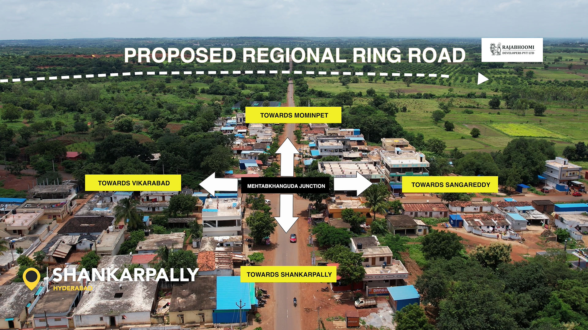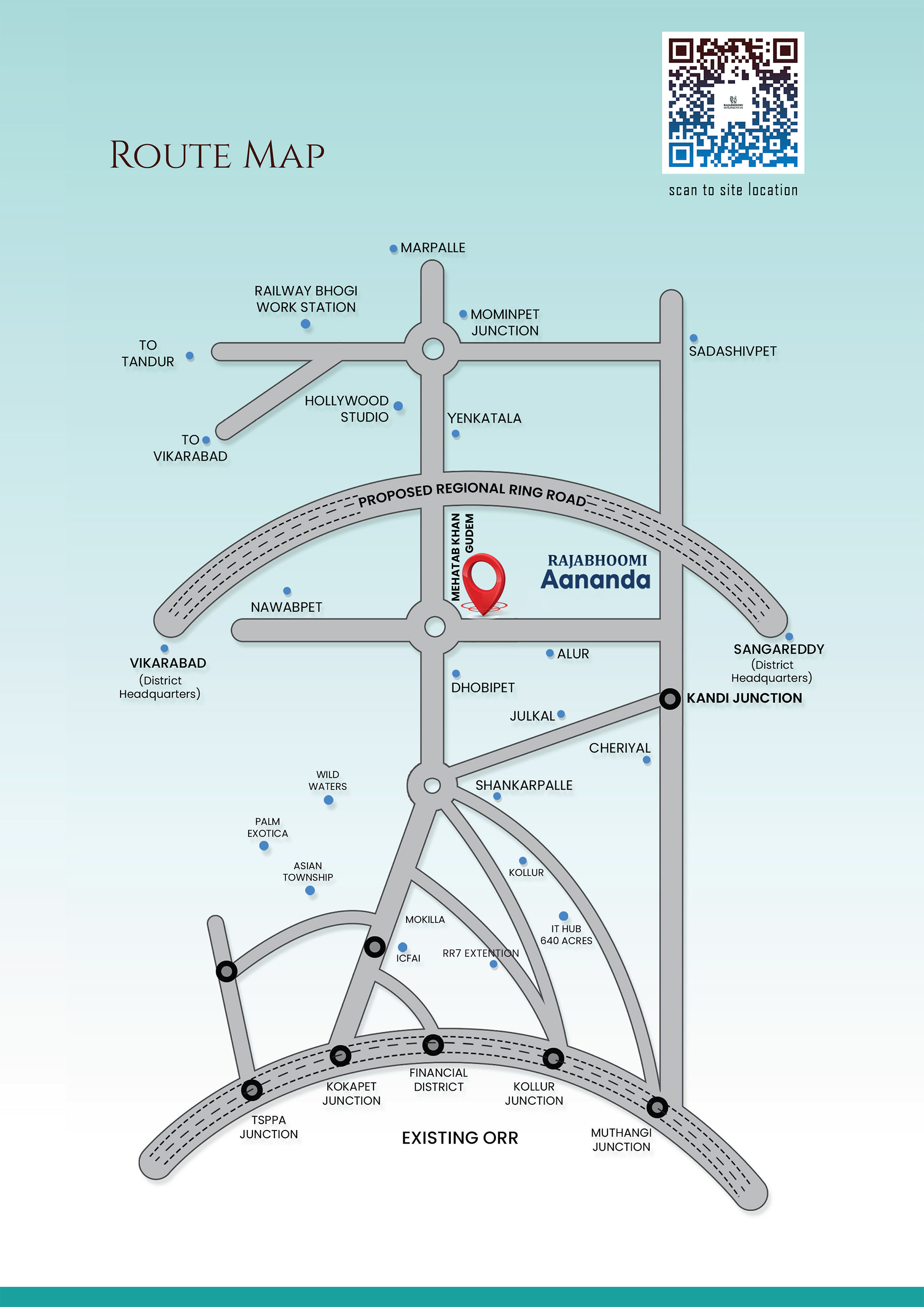 Rajabhoomi Aananda is strategically located within the burgeoning development triangle of Mehtabkhanguda, Mominpet, and Vikarabad, to the west of Hyderabad. This area is rapidly becoming one of the most promising investment destinations in Telangana. Its central position within this growth hotspot provides Rajabhoomi Aananda with a unique advantage to leverage the region's expanding potential and capitalize on the anticipated growth and development in the area.